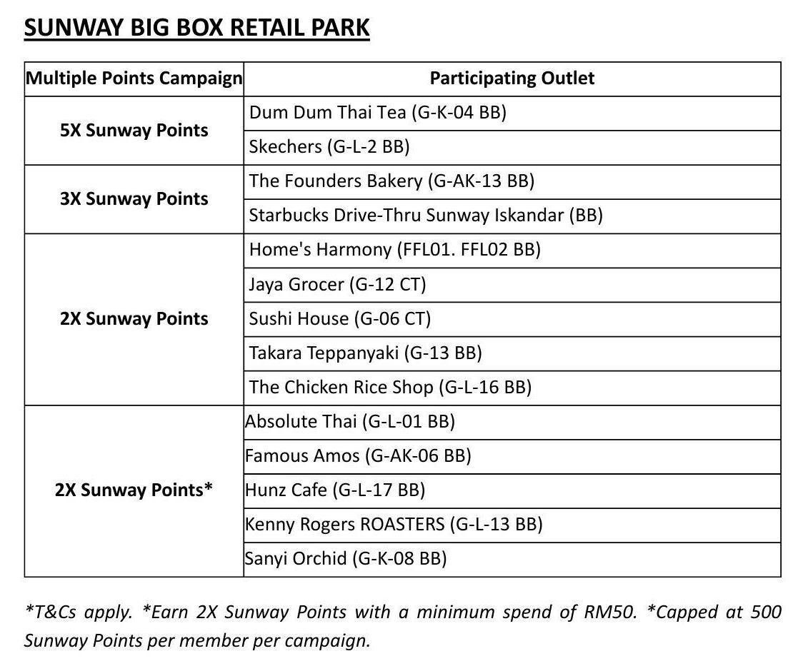 The 2X Sunway Points* reward is applicable only with a minimum spend of RM50, and capped at a maximum of 500 Sunway Points awarded to each member throughout the entire campaign or conclude once in total reaches 2,500,000 Sunway Points, whichever comes first.